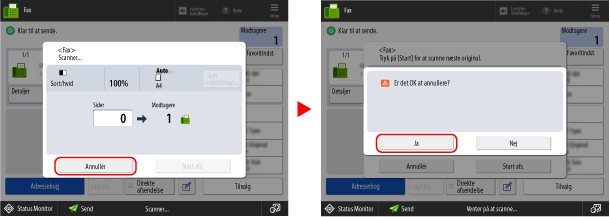 Når du sender en fax med maskinen, kan du annullere faxafsendelsen ved at følge instruktionerne på skærmen.