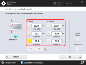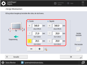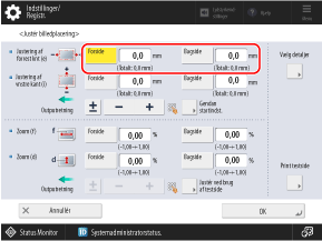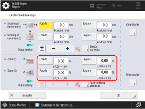 * Når du viser skærmbilledet [Justér billedplacering] efter at have udført Juster venstre kantjustering eller Juster den forreste kantjustering, nulstilles værdien på skærmen til "0,0 mm", men den tidligere indstillede værdi bibeholdes. Hvis du vil gentage justeringen, skal du kontrollere indikatoren på den genudskrevne testside og indstille denne værdi.