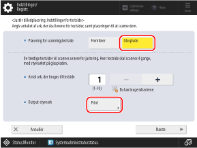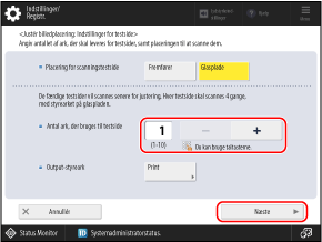 Vælg [Fremfører] for [Placering for scanningstestside], indstil antallet af ark, der skal udskrives, og tryk derefter på [Næste].