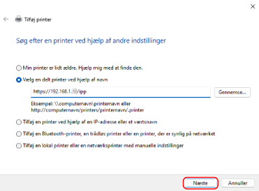 Vælg [Vælg en delt printer ved hjælp af navn], og vælg forbindelsesdestinationen, og klik på [Næste].