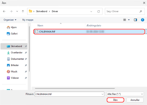 Åbn printerdriverens mappen, vælg INF-filen i mappen [Driver], og klik på [Åbn].