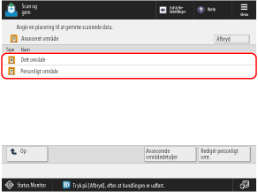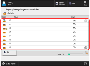Destinationen for lagring vises på maskinens betjeningspanel, så du kan bekræfte destinationen for lagring og gemme scannede data.