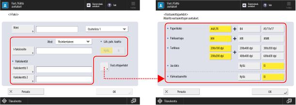 Kun rekisteröit faksin vastaanottajan osoitekirjaan tai pikavalintapainikkeeseen, määritä alla kuvatut kohteet.