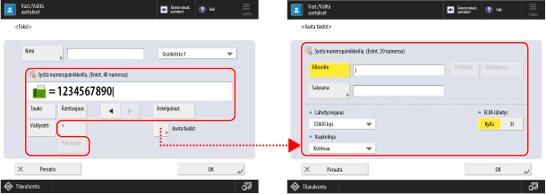 * Laite tukee ITU-T:n (International Telecommunication Union-Telecommunication Standardization Sector) standardialiosoitteiden käyttöä. Jos kohdelaite tukee aliosoiteviestintää (luottamuksellinen viestintä), voit parantaa lähetettyjen asiakirjojen luottamuksellisuutta asettamalla aliosoitteen ja salasanan lähetystä varten.