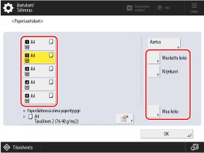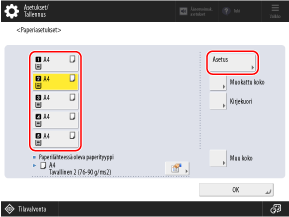 Valitse paperikasetti, jonka asetusta haluat muuttaa, ja paina [Aseta].