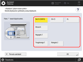 Joillakin kirjekuorten kokoasetuksilla [Seuraava] saattaa näkyä. Paina [Seuraava], syötä kirjekuoren läpän pituus ja paina sitten [OK].