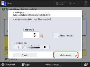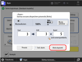 Ennen kuin painat [Aloita kopiointi], syötä kopioiden lukumäärä uudelleen numeropainikkeita käyttäen.