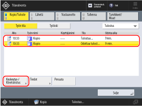 * Jos nykyinen kopio- tai tulostustoiminto on keskeytystyö, valittu varattu kopiotyö alkaa, kun nykyinen keskeytystyö on valmis.