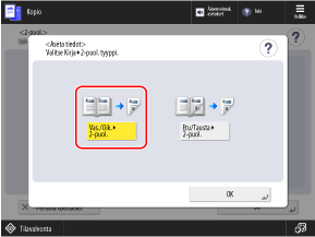 Voit myös tehdä kaksipuolisia kopioita, joissa alkuperäisen vasen ja oikea sivu kopioidaan yhden arkin molemmille puolille, tai kaksipuolisia kopioita, joissa vasemman tai oikean sivun etu- ja taustapuoli auki levittäytyvästä alkuperäisestä kopioidaan yhden paperiarkin molemmille puolille.