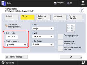Oletuksena syötetään laitteeseen asetettu päivämäärä. Jos haluat lisätä eri päivämäärän, kirjoita se numeronäppäimillä.