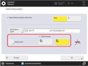 Jos määrität sähköpostiosoitteen tai tiedoston tallennuspaikan, faksit välitetään tai tallennetaan TIFF- tai PDF-tiedostoina.