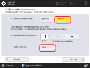 Valitse [Syöttölaite] asetukselle [Testisivun skannauksen paikka], määritä tulostettavien arkkien määrä ja paina sitten [Seuraava].