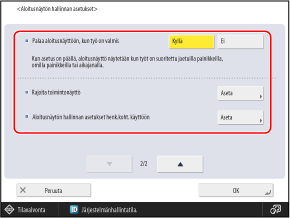 Voit määrittää asetukset, kuten kohteet, joita kukin käyttäjä voi mukauttaa [Päävalikko]-näytössä, sekä sen, näytetäänkö toiminnot ja asetuspainikkeet [Päävalikko]-näytössä.