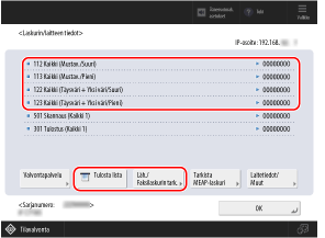 Voit tarkistaa tulostettujen ja kopioitujen sivujen määrän [Laskurin/laitteen tiedot] -näytön kohdista ”Yhteensä” tai ”Kopiot”.