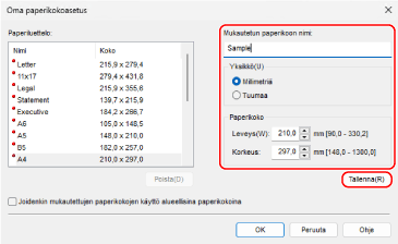 Anna mukautetun paperikoon nimi ja paperikoko ja napsauta [Tallenna].