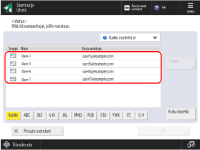 Voit suodattaa luettelossa näkyvät vastaanottajat valitsemalla jonkin näistä: näytön alareunassa näkyvä hakemisto, [Haku nimellä] tai valinta osoiteluetteloiden alasvetovalikosta.