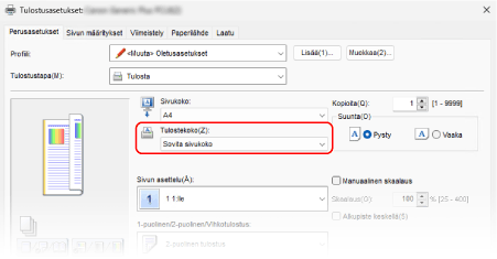 Tarkista tai aseta tulostettavan paperin koko kohdassa [Tulostekoko] [Perusasetukset]-välilehdellä.