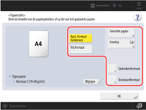 Als papier in de multifunctionele lade is geplaatst, verschijnt het volgende scherm op het bedieningspaneel. Stel papierformaat en -soort in voor het geplaatste papier.