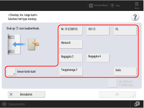 Druk op [Invoer lange kant] of [Invoer korte kant] afhankelijk van de richting van de enveloppen en selecteer het envelopformaat.