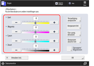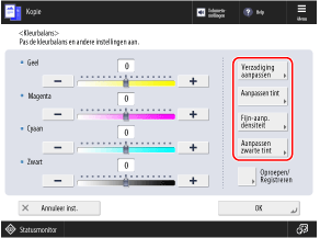 Als u vaak originelen met een specifieke kleurtoon gebruikt, kunt u de aangepaste kleurinstellingen registreren. U kunt dan de instellingen op het scherm oproepen om de kleurenbalans aan te passen, zodat u de kleurenbalans niet elke keer opnieuw hoeft in te stellen.