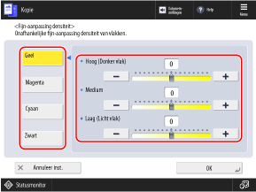 U kunt op [Laag] of [Hoog] drukken voor [Alle kleuren] om de schuifregelaars van alle kleuren tegelijk te verplaatsen.