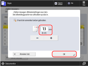 De instelling van de afdrukpositie is niet nodig als u niet op het tabbladgedeelte kopieert. Druk op [OK] zonder deze instelling te configureren en ga verder met stap