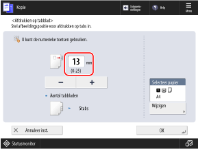 Druk op [Wijzigen] onder [Selecteer papier], selecteer het tabblad waarop u het tabblad wilt kopiëren en druk op [OK].