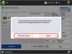 De fax wordt verzonden zodra het scannen is voltooid. U kunt [ Statusmonitor] gebruiken om de verzendstatus en het logboek te controleren. Status en logboek voor verzonden en ontvangen faxen controleren