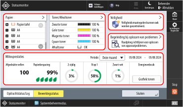 U kunt een scherm weergeven om de status van meerdere opties tegelijk te controleren, zoals de resterende hoeveelheid papier en toner, de status van de beveiligingsmaatregelen van de machine, ondersteuningsinformatie voor het oplossen van problemen tijdens faxen en afdrukken, en de afdrukopdrachtstatus en het energieverbruik binnen een opgegeven tijdsperiode.