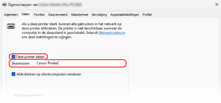 Schakel op het tabblad [Delen] het selectievakje [Deze printer delen] in en voer een gedeelde naam in.