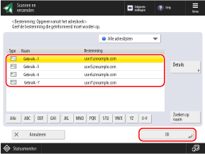 Selecteer in het scherm Adresboek de bestemming (e-mailadres) die u als meldingsbestemming wilt instellen en druk op [OK].