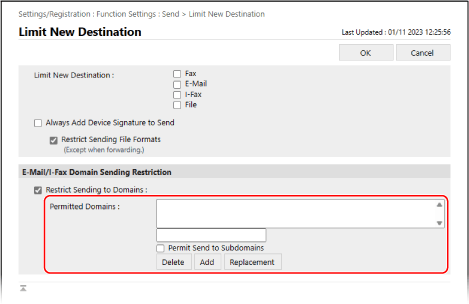 Voeg in de lijst [Permitted Domains] de domeinen toe die moeten worden toegestaan als verzendbestemmingen.