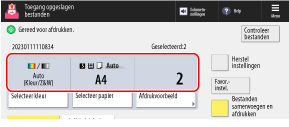 De momenteel ingestelde afdrukkleur, het te gebruiken papier en het aantal afdrukken worden in het midden van het scherm getoond. Controleer deze instellingen om te waarborgen dat er correct wordt afgedrukt.