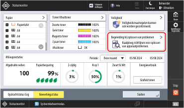 De ondersteuningsinformatie voor het oplossen van problemen met afdrukken, faxen en verzenden van gescande gegevens kan worden gecontroleerd in [Begeleiding bij oplossen van problemen] in de bedrijfsstatus van de machine. De werkingsstatus van de machine controleren