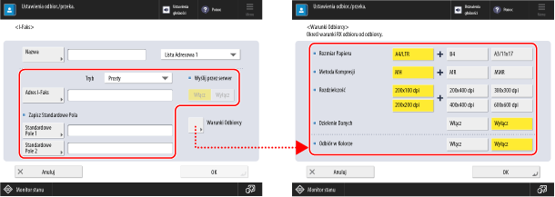 Jeśli ustawisz tę opcję na [Włącz], naciśnij [Dalej] i ustaw rozmiar papieru i rozdzielczość obsługiwaną przez urządzenie docelowe, gdy odbiera kolor.