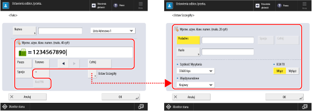 * Urządzenie obsługuje standardowe podadresy ITU-T (Międzynarodowy Związek Telekomunikacyjny – Sektor Normalizacji Telekomunikacyjnej). Jeśli urządzenie docelowe obsługuje komunikację podadresową (komunikacja poufna), możesz zwiększyć poufność wysyłanych dokumentów, ustawiając podadres i hasło do wysyłania.