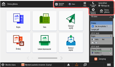 Można wybrać opcję [Status / rejestr zadania], aby sprawdzić stan przetwarzania i historię każdej funkcji oraz pozostałą ilość materiałów eksploatacyjnych i części.
