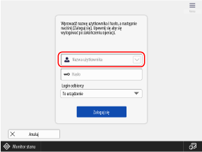 Ekran [Strona główna]Ekran logowania wyświetla się automatycznie podczas korzystania z funkcji wymagającej uwierzytelnienia. Po zalogowaniu ekran się zmieni i będzie można kontynuować pracę.
