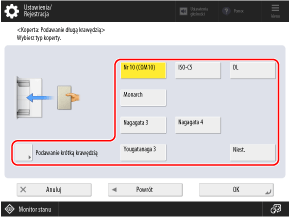 Naciśnij [Podawanie długą krawędzią] lub [Podawanie krótką krawędzią] w zależności od orientacji kopert i wybierz rozmiar koperty.