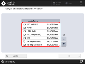 Informacje na temat rozmiarów papieru wyświetlanych po naciśnięciu przycisku [Inny Rozmiar] można znaleźć poniżej: