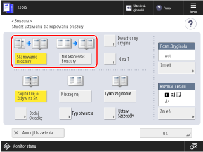 Standardowo należy wybrać ustawienie [Skanowanie Broszury]. Jeśli używasz oryginału, którego strony są już ułożone w układzie broszury, wybierz opcję [Nie Skanować Broszury].