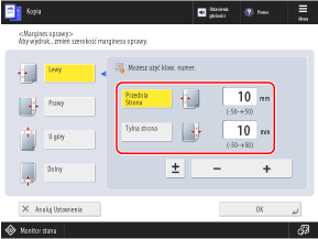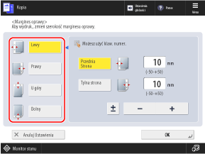 Podczas kopiowania można dodać margines (rynnę) na zszycie lub dziurkowanie. Margines można skonfigurować oddzielnie dla przedniej i tylnej strony papieru.