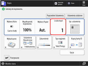 Kopiowanie natychmiastowe (przerwanie)* Wykonując dużą liczbę kopii, możesz wykonać próbną kopię, aby sprawdzić efekt końcowy, lub możesz skopiować oryginał pojedynczo, aby sprawdzić wygląd przed skopiowaniem wszystkich stron razem.