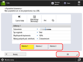 Na ekranie [Poprzednie Ustawienia] wybierz historię, którą chcesz przywołać, i naciśnij przycisk [OK].