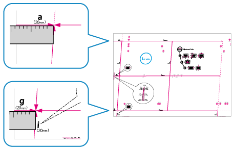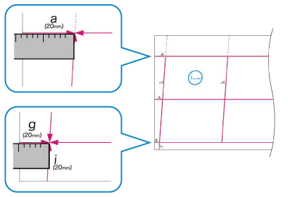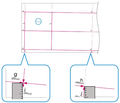 W zależności od rozmiaru drukowanego papieru wskaźniki „b”, „f”, „h” i „j” mogą być drukowane wielokrotnie. Wykonaj regulację dla miejsc znajdujących się najbliżej tylnej krawędzi papieru.