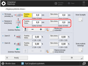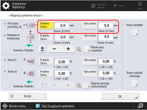 * Po wyświetleniu ekranu [Regulacja Położenia Obrazu] po wykonaniu opcji Dostosuj wyrównanie lewej krawędzi lub Dopasuj wyrównanie krawędzi górnej wartość na ekranie zostanie zresetowana do „0,0 mm”, ale poprzednio ustawiona wartość zostanie zachowana. Jeśli chcesz powtórzyć regulację, sprawdź wskaźnik na ponownie wydrukowanej stronie testowej i ustaw tę wartość.