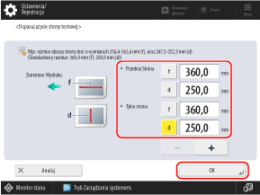 Naciśnij przycisk [Dopasuj używając strony testowej], wprowadź zmierzone wartości w polu [f] i [d], a następnie naciśnij przycisk [OK]