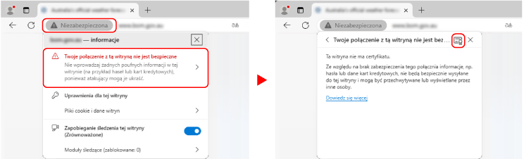 W polu wprowadzania adresu URL kliknij [Niezabezpieczone] [Twoje połączenie z tą witryną nie jest bezpieczne] [] (Certyfikat).