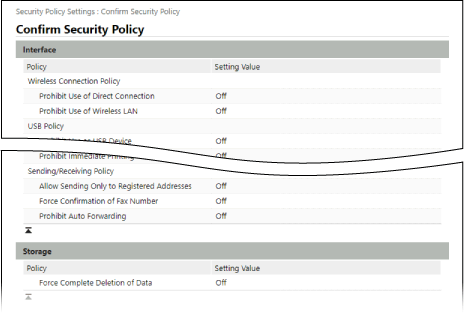 Możesz skonfigurować i sprawdzić następujące elementy na ekranie [Security Policy Settings] lub ekranie [Confirm Security Policy] Remote UI (Zdalny interfejs użytkownika).