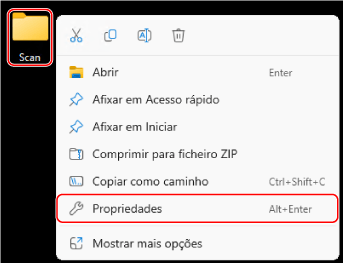 Clique com o botão direito do rato na pasta criada e clique em [Propriedades].
